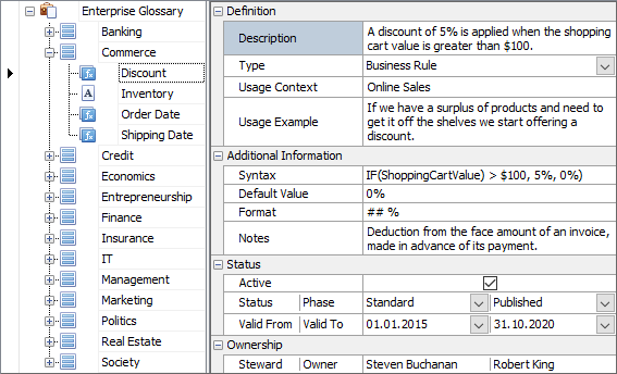 20 new property fields have been added to better manage a common business vocabulary and make it available across an organization.