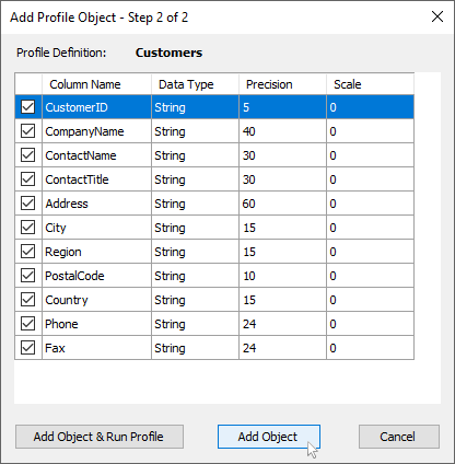 With step 2 you can select the columns you want to include in the data profile. You can also add the profile object and run the data profile.