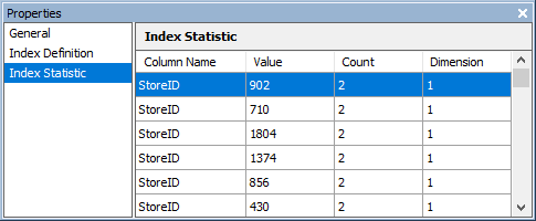 Metadata index properties are displaying General, Index Definition and Index Statistic properties.