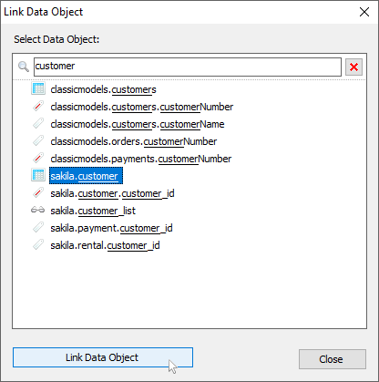 Link Data Object dialog has been updated. There is a search bar now available. Button Cancel has been replaced with button Close in Link Data Object, Link Reference and Link Schema dialog.