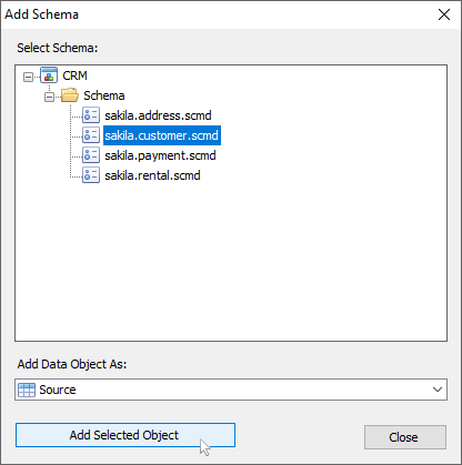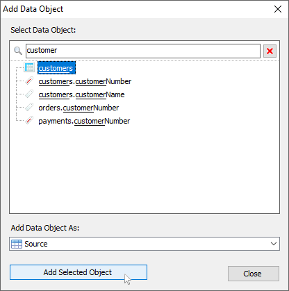 The new button Add Data Object opens the new Add Data Object dialog for adding source and target data objects. And there is a search bar for filtering data objects. Moreover, button Cancel has been replaced with button Close.