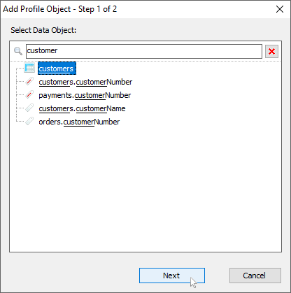 There is a search bar for filtering data objects in Add Profiling Object dialog.