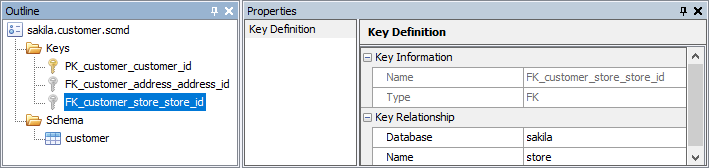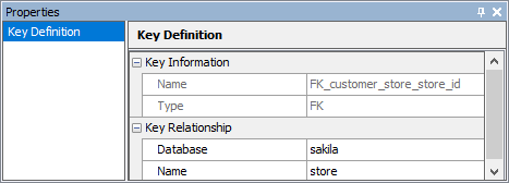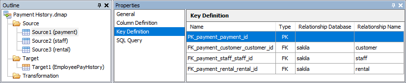 Primary and foreign keys are displayed for Source and Target in Key Definition section of Properties window.
